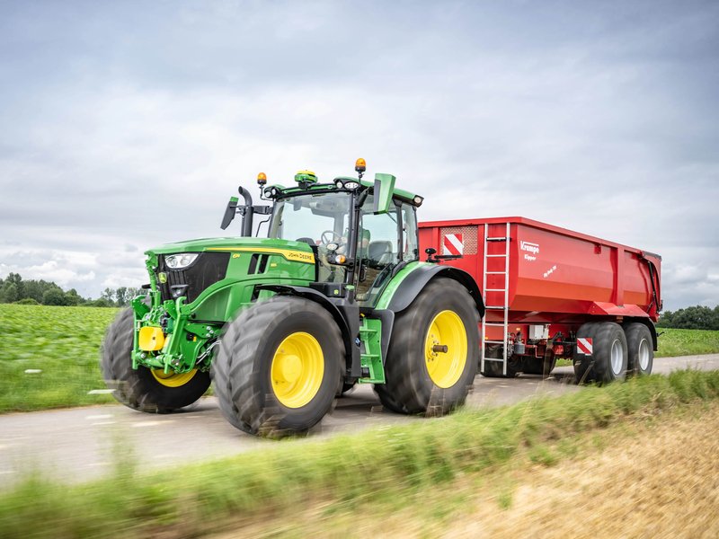Erntezeit auf der Straße: Jetzt heißt es aufmerksam fahren und Gefahren früh erkennen. Bild: John Deere